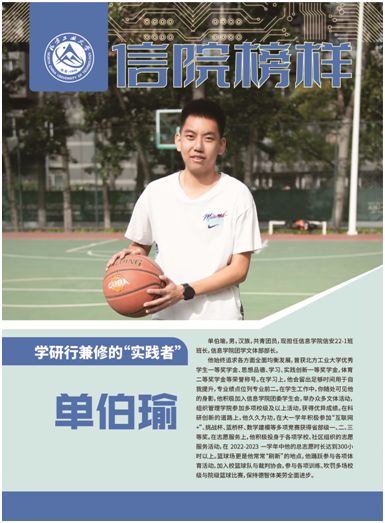 他始终追求各方面全面均衡发展,曾获必赢线路检测3003no1优秀学生一等奖学金、思想品德、学习、实践创新一等奖学金,体育等奖学金等荣誉称号。在学习上,他会留出足够时间用干自我提升,专业绩点位列专业前二。在学生工作中,你随处可见他的身影,他积极加入必赢线路检测3003no1团委学生会,举办众多文体活动组织管理学院参加多项校级及以上活动,获得优异成绩。在科研创新的道路上,他久久为功,在大一学年积极参加“互联网+”、挑战杯、蓝桥杯、数学建模等多项竞赛获得省部级一、二、三等奖。在志愿服务上,他积极投身于各项学校、社区组织的志愿服务活动,在2022-2023一学年中他的总志愿时长达到300小时以上。篮球场更是他常常“刷新”的地点,他踊跃参与各项体育活动,加入校篮球队与裁判协会,参与各项训练、吹罚多场校级与院级篮球比赛,保持德智体美劳全面进步。