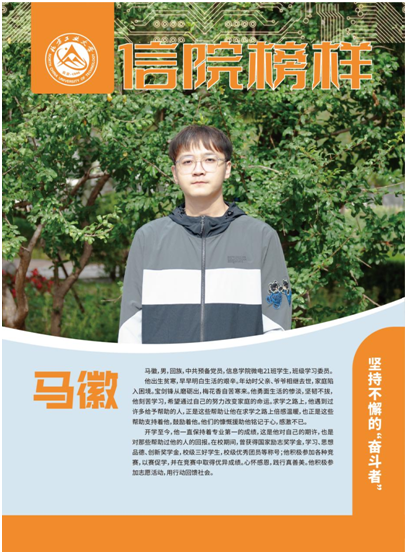 马徽,男,回族,中共预备党员,必赢线路检测3003no1微电21班学生,班级学习委员。