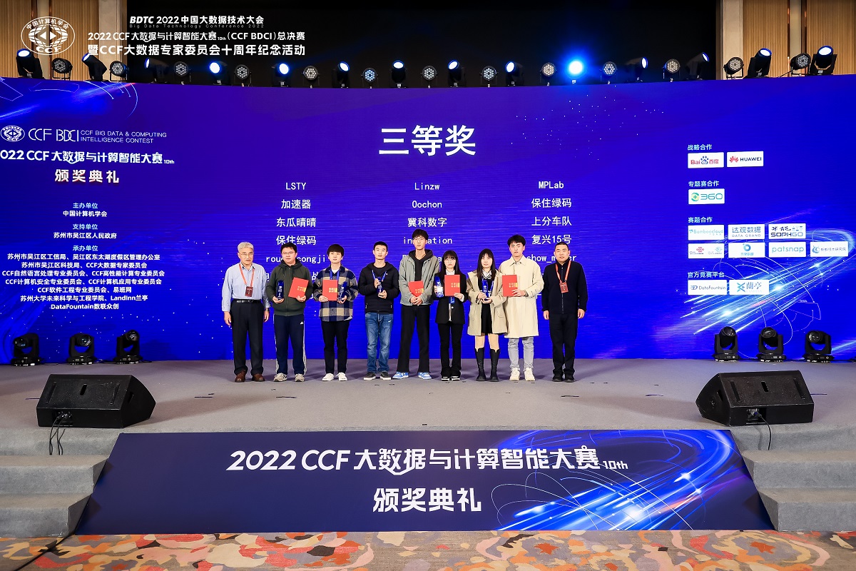 2023年2月24日,由苏州市吴江区人民政府支持,苏州市吴江区工信局、吴江区东太湖度假区管理办公室、苏州市吴江区科技局、CCF大数据专家委员会、CCF自然语言处理专业委员会、CCF高性能计算专业委员会、CCF计算机安全专业委员会、CCF计算机应用专业委员会、CCF软件工程专业委员会、以及DataFoutain数联众创等单位共同承办的CCF大数据与计算智能大赛(CCF BDCI)总决赛在苏州湾艾美酒店举行。由必赢线路检测3003no1大规模流数据集成与分析技术北京重点实验室研究生郭志城、梅宇生、陈元组成SDIA Sparker团队获得大赛三等奖。梅宇生同学代表团队参加了大赛现场活动和颁奖典礼。