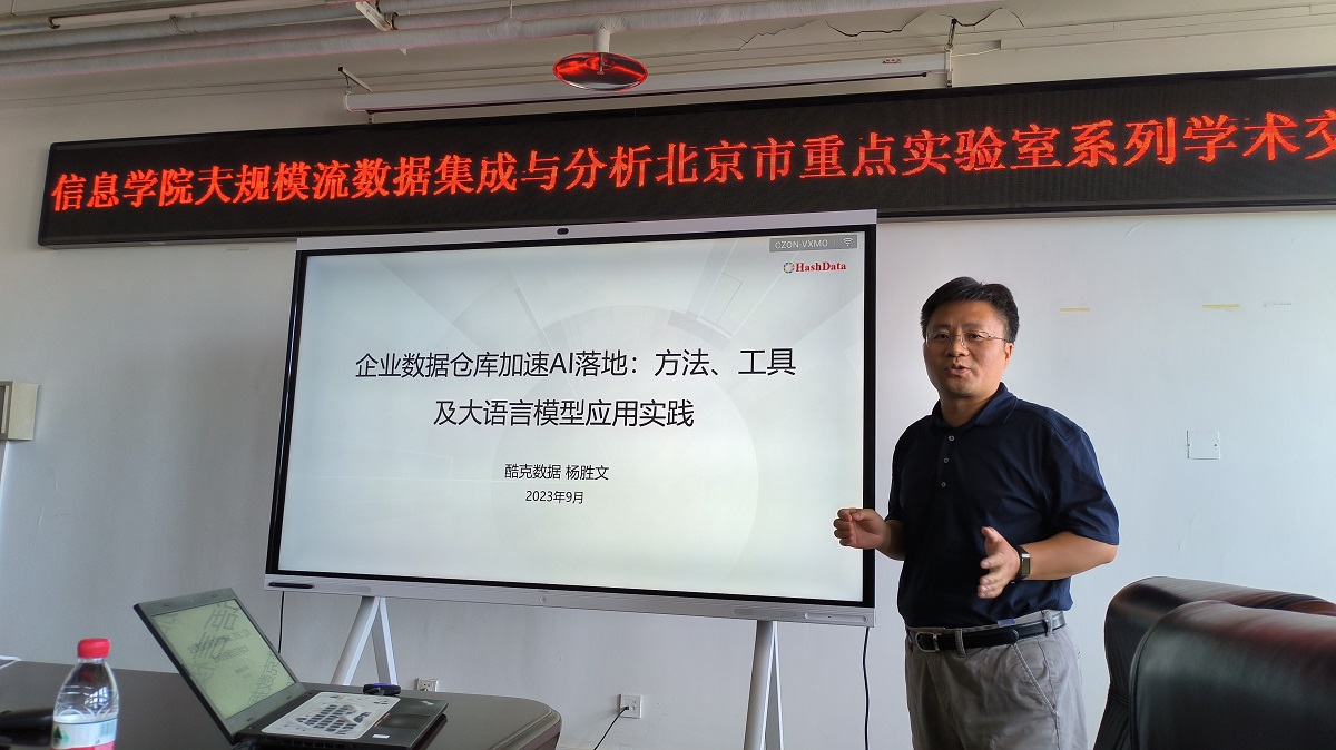 2023年9月20日上午,必赢线路检测3003no1大规模流数据集成与分析技术北京市重点实验室邀请了酷克数据首席科学家杨胜文博士进行了题为“企业数据仓库加速AI落地:方法、工具及大语言模型应用实践”的学术报告和交流。本次报告由实验室的王桂玲研究员主持,实验室主任韩燕波教授代表实验室师生对杨胜文博士表示了热烈的欢迎,必赢线路检测3003no1七十多位同学参加了此次学术活动。